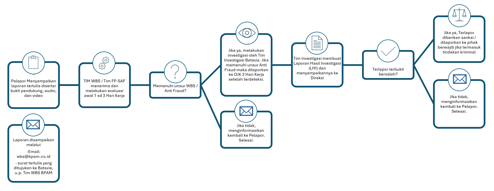 Kami menjunjung tinggi integritas, transparansi, dan tata kelola yang baik dalam setiap kegiatan usaha. Sebagai bentuk komitmen terhadap prinsip-prinsip tersebut, Batavia menyediakan Whistleblowing System (WBS) sebagai sarana bagi karyawan, Nasabah, mitra, maupun pihak eksternal untuk menyampaikan laporan atas dugaan pelanggaran, kecurangan (fraud), atau tindakan yang tidak sesuai dengan etika dan peraturan yang berlaku. Laporan dapat disampaikan secara anonim (tanpa mencantumkan identitas). Batavia memastikan bahwa setiap laporan yang diterima akan ditindaklanjuti secara professional, dengan menjunjung tinggi prinsip kerahasiaan, kehati-hatian, dan perlindungan terhadap pelapor. Kami menjamin tidak aka nada tindakan diskriminatif ataupun pembalasan dalam bentuk apapun dari pihak yang dilaporkan. Melalui sistem ini, Batavia menyakini dapat memperkuat budaya integritas, meningkatkan kepercayaan pemangku kepentingan, serta mendukung terciptanya lingkungan kerja dan bisnis yang bersih yang bersih, akuntabel, dan berkelanjutan.